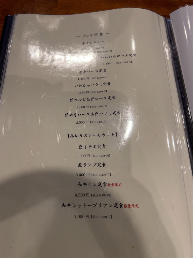 2023-02-18 炭火焼肉 いわむら・・・2回目 【グルメ】愛知県小牧市 2023年2月18日 土曜日 13時 駐車場は少ないですが、ほどよい混み具合で問題なし。清潔感有り。久々に行きましたがメニュー表が新しくなっていました。 【ランチメニュー】 値段が幅広いですね。ランチにシャトーブリアンは中々手が出せないですが、ここらであまり見かけないので貴重ですね^^ 【テイクアウト】 いわむらハラミ定食 ¥1800 ご飯のおかずになるのは肉のみ♪ですが、肉は十分過ぎるほど美味いです。 炭火焼肉 いわむら (焼肉 / 小牧口駅) 昼総合点★★★☆☆ 3.5